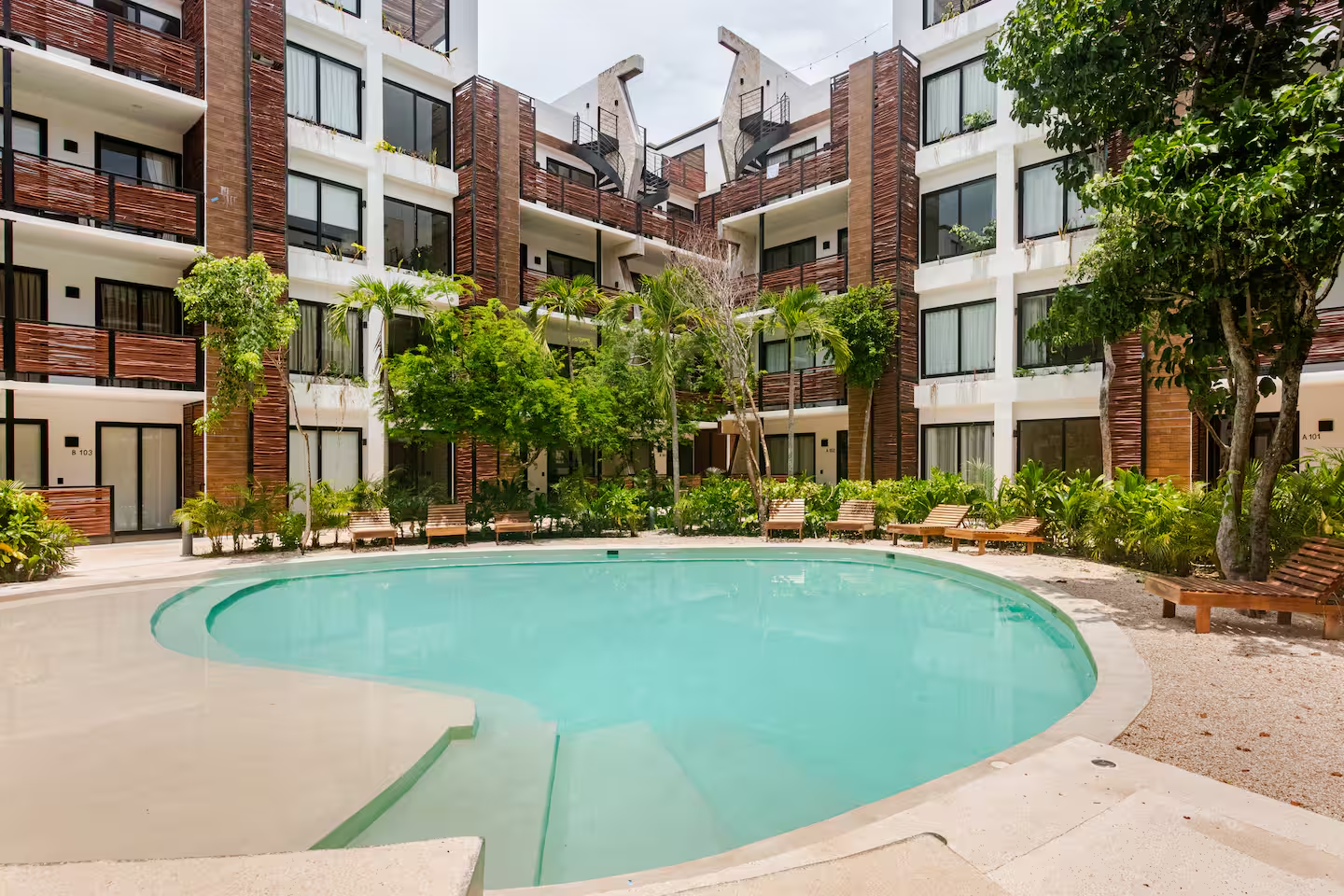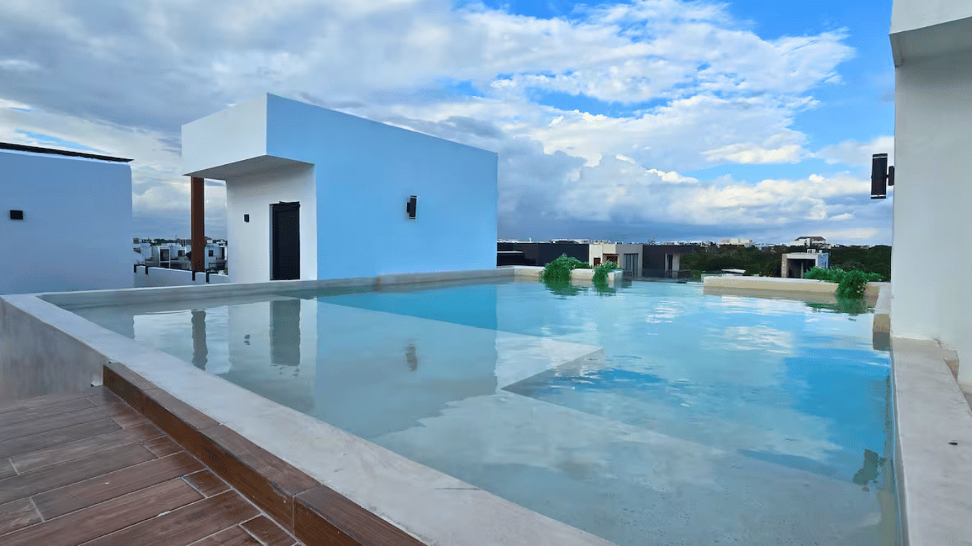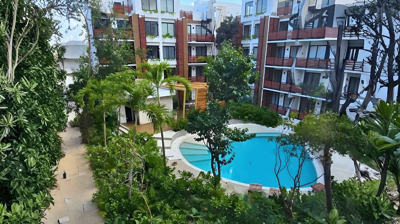 Condo-Hotel, con servicios de Lavandería ya incluida, Recepción, Vigilancia 24/7, Elevador, 2 Albercas tipo Cenote y 1 Alberca en el Techo tipo infinita, Rooftop, Gimnasio, Ludoteca, Sala de Cine, Sala de Juegos, Sala de Negocios.